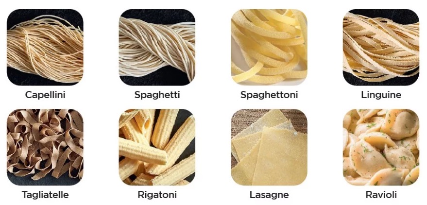 Les 7 moules fournis permettent de réaliser 8 sortes de pâtes : spaghetti classique, spaghetti épais, linguine, tagliatelle, capellini, rigatoni, lasagne et ravioli.