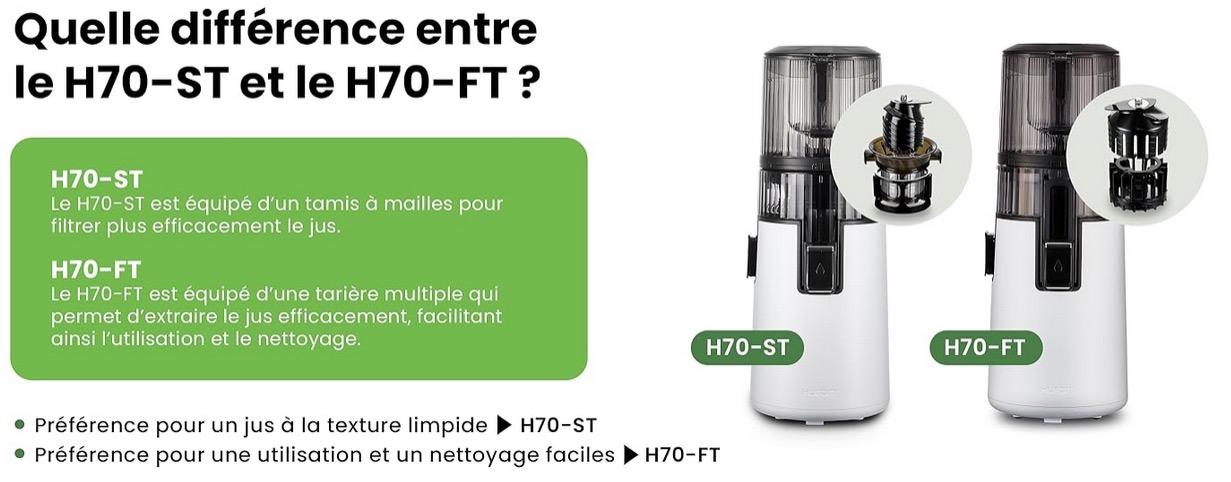 Le H70-ST Hurom est le dernier modèle Hurom (nouveauté 2025). Grâce à la vis sans fin + filtre à maille fine + brosse rotative = jus dépourvu de fibres, parfaitement filtré. Comme tous les modèles Hurom, il est facile d’utilisation, rapide à nettoyer.