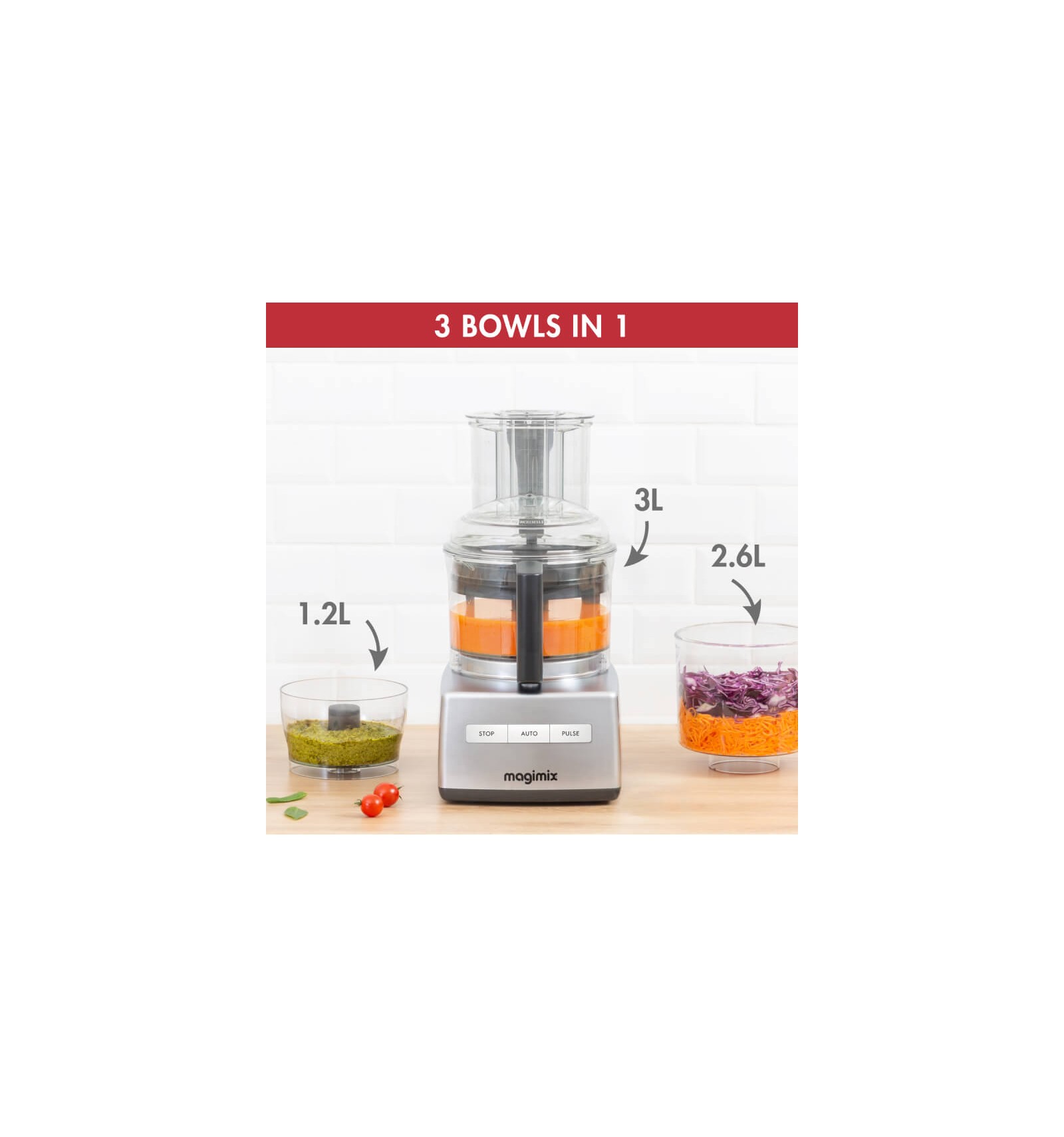 Bol principal 3 L : pour toutes les préparations Midi bol 2,6 L : pour émincer et râper les légumes Mini bol 1,2 L : pour toutes les petites préparations mixées Autonomes, les 3 bols en 1 vous permettront d'enchaîner les préparations !